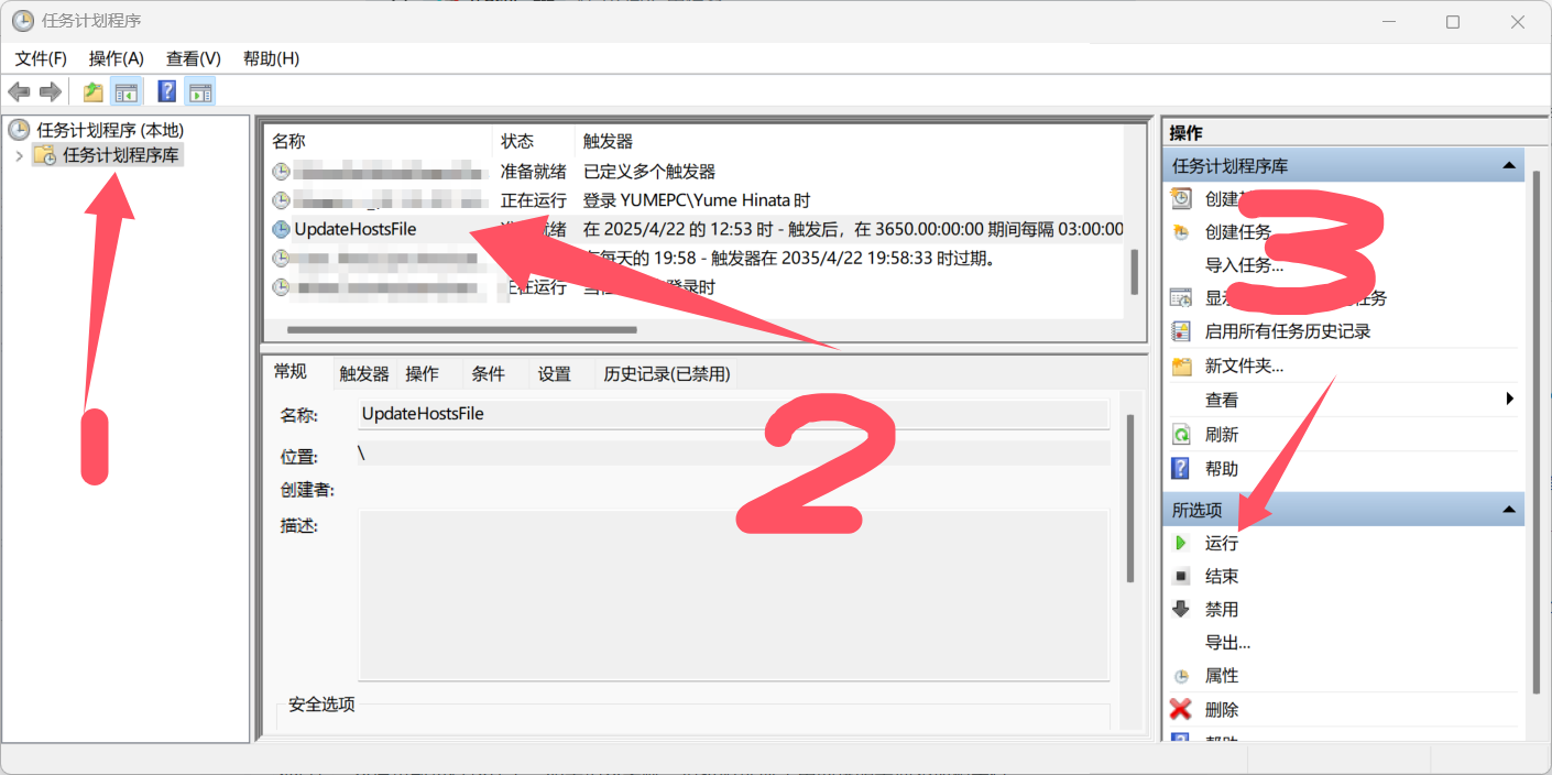 exit运行完这个脚本后打开任务计划程序-->任务计划程序库-->UpdateHostFile-->运行
